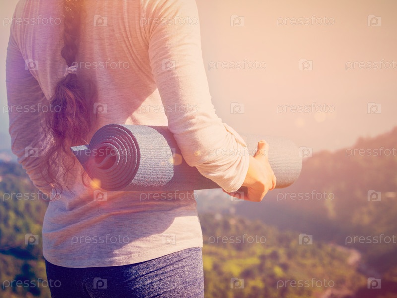 Женщина стоит с ковриком для йоги на открытом воздухе в горах, рядом с копировальным помещением.Просохшие огни и мигающие линзы.Винтажный ретро-эффект фильтрует изображение хипстерского стиля