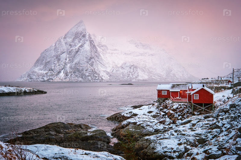 Известная туристическая достопримечательность рыбацкая деревня Хамна на Лофотенских островах, Норвегия с домами из красного руербу