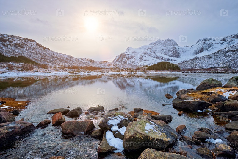 Закат солнца в норвежском фьорде зимой.Острова Лофотен, Норвегия