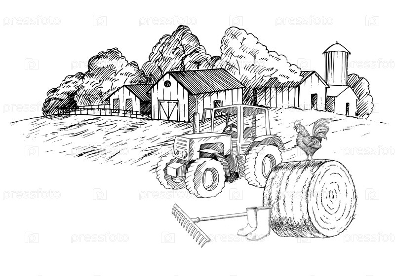 Трактор и петух на стоге сена в сельском фермерском ландшафте Векторная чернила в стиле иллюстрации ручной работы. для дизайна упаковки, карт, обложек, принтов, этикеток продуктов и тканей