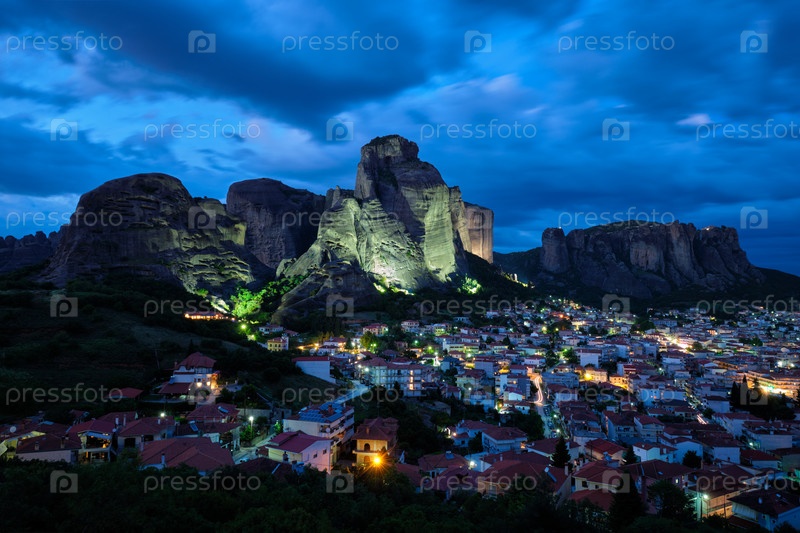 Деревня Каламбака в знаменитом греческом туристическом направлении Метеора в Греции ночью