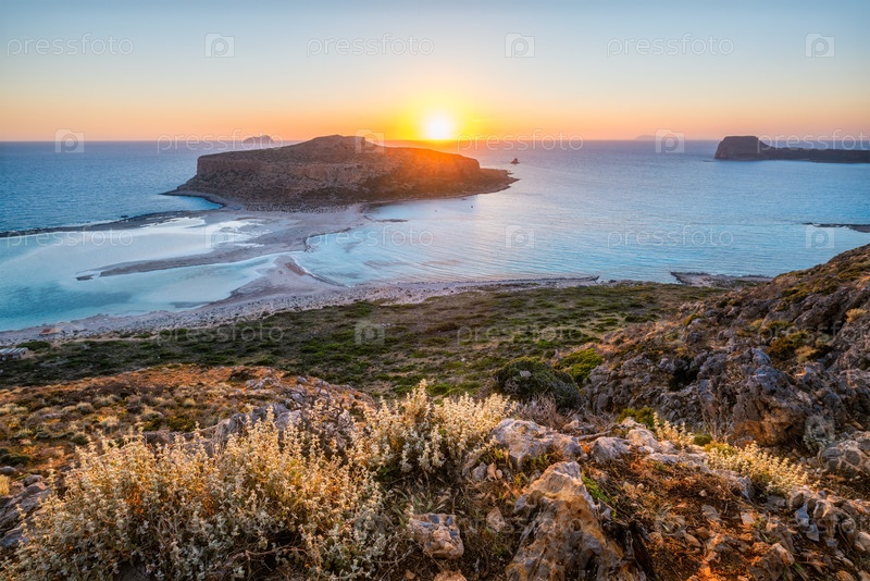Остров Грамвуза и красивый пляж Балос при закате солнца на острове Крит, Греция