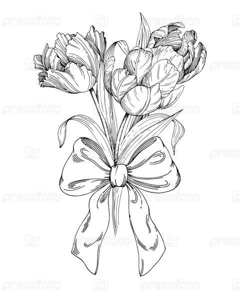 Букет тюльпанов и лука. Ручная векторная иллюстрация тюльпана чернилами. Для проектирования карт, обложек, печатных работ, этикеток продуктов и тканей