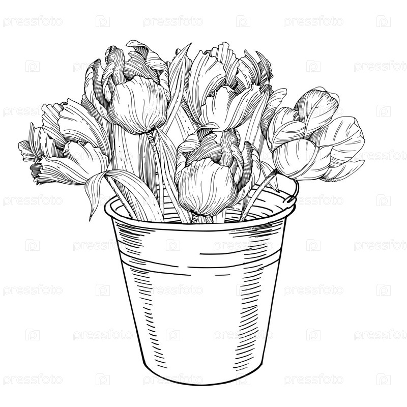 ведро тюльпанов. ручная векторная иллюстрация тюльпана чернилами. для проектирования карт, обложек, печатных работ, этикеток продуктов и тканей