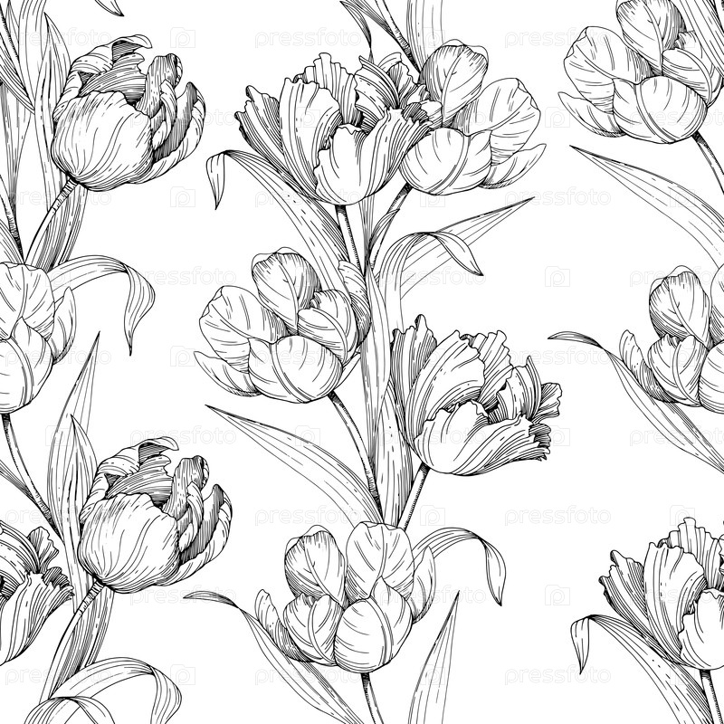 Бесшовный рисунок тюльпанов. Ручная векторная иллюстрация тюльпана чернилами. Для проектирования карт, обложек, печатных работ, этикеток продуктов и тканей