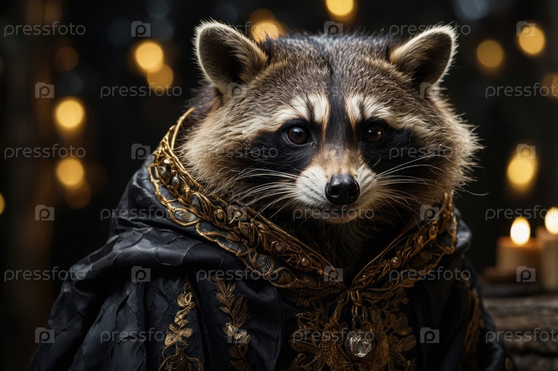 Милое животное-ракун в костюме на темном страшном фоне Хэллоуина AI Generative