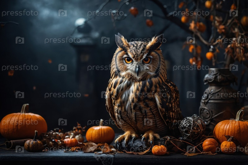 Генеративный ИИ Owl Bird на темном страшном фоне осенних праздников Хэллоуина