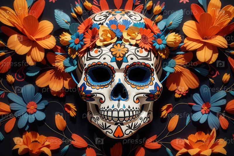 Генеративный череп с традиционным макияжем для Дня мертвых в красочных цветах Dia de los Muertos