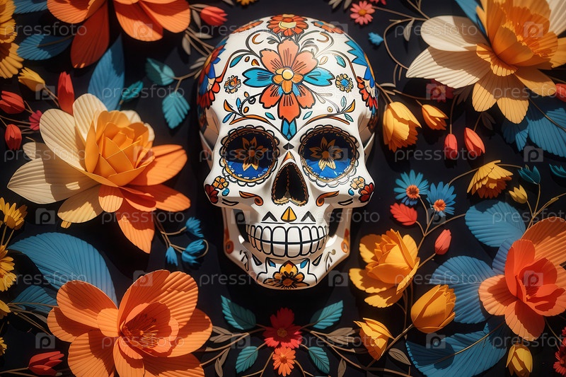 Генеративный череп с традиционным макияжем для Дня мертвых в красочных цветах Dia de los Muertos