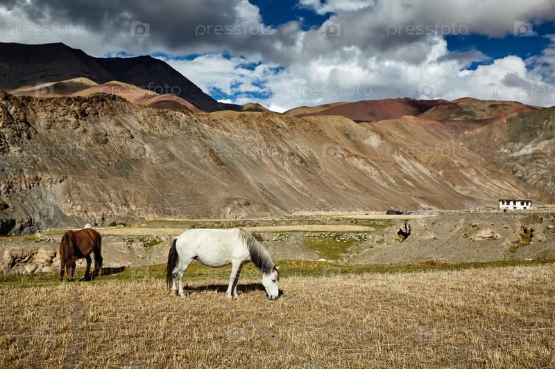 Лошади пасутся в Гималаях.Ладак, Индия