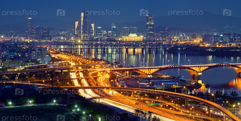 Городской пейзаж Сеула на закате, Южная Корея