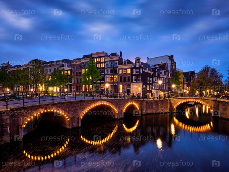 Амтердамский канал, мост и средневековые дома вечером