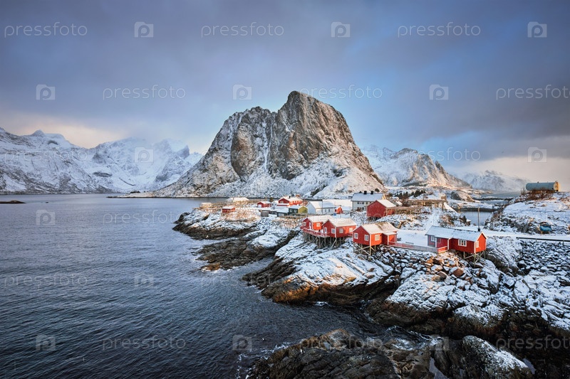 Известная туристическая достопримечательность рыбацкая деревня Хамна на Лофотенских островах, Норвегия с красными домами руербу зимой
