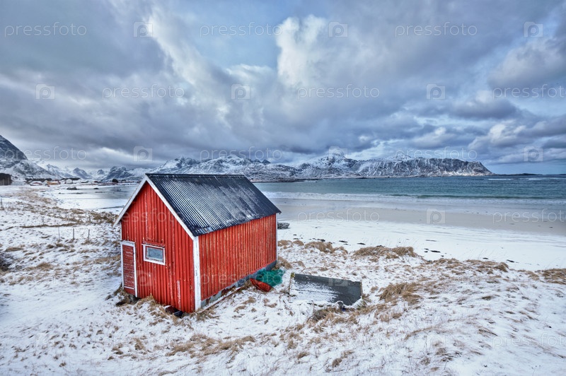 Красный сарай на пляже фьорда, Норвегия