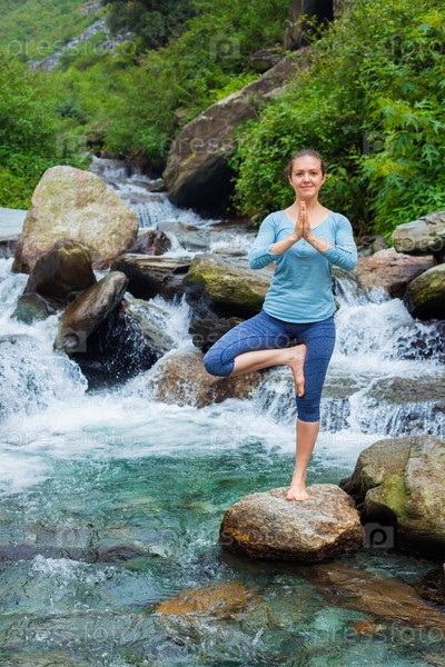 Женщина в асане йоги Vrikshasana позирует у водопада на открытом воздухе