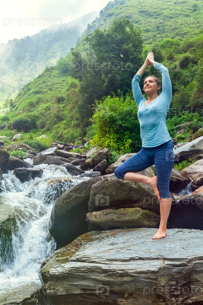 Женщина в асане йоги Vrikshasana позирует у водопада на открытом воздухе