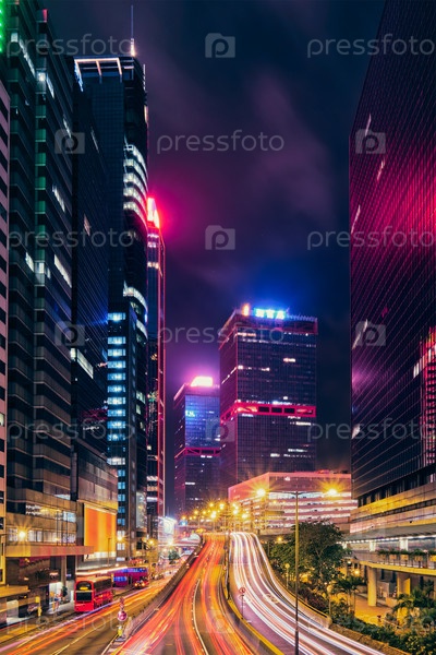 Уличное движение в Гонконге ночью.Офисные небоскребы и оживленный трафик на шоссе с размытыми пассажирскими дорожками.Гонконг, Китай