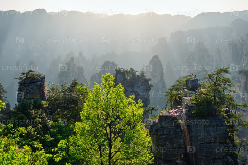Известная туристическая достопримечательность Китая - каменные столбы скальных гор Чжанцзянджи при закате солнца в Улингюане, провинция Хунань, Китай