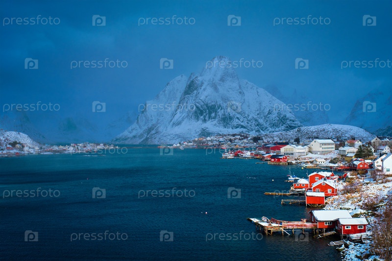 Рейнская рыбацкая деревня на Лофотенских островах с красными домами руербу зимой со снегом. Норвегия
