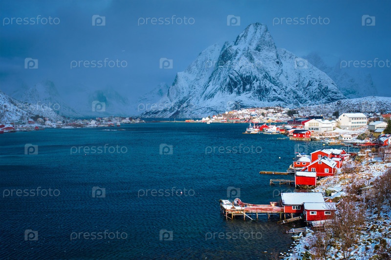 Рейнская рыбацкая деревня на Лофотенских островах с красными домами руербу зимой со снегом. Норвегия