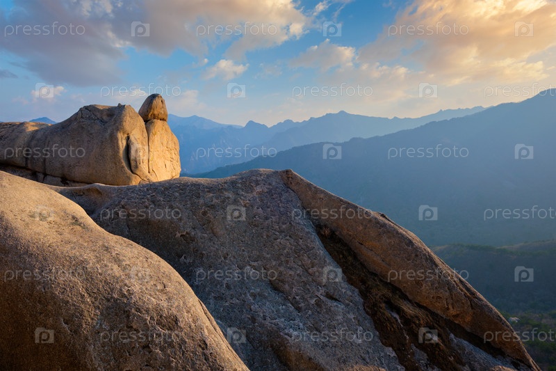 Вид на скалы и каменные образования с вершины Ульсанбави при закате солнца
