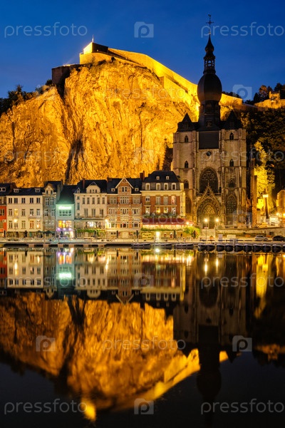 Ночные виды на город Динан, университетскую церковь Нотр-Дам де Динан над рекой Мауза и мост Шарля де Голля и Цитадель Динан освещаются вечером