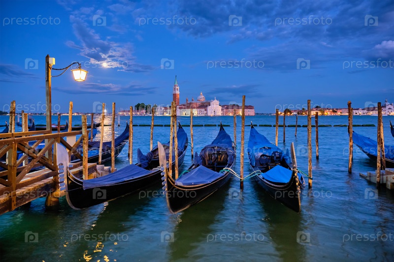 Туристическим фоном Венеции являются гондолы на площади Святого Марка (Сан-Марко) и церковь базилики San Giorgio Maggiore, которую можно увидеть через венецианскую лагуну при полнолунии
