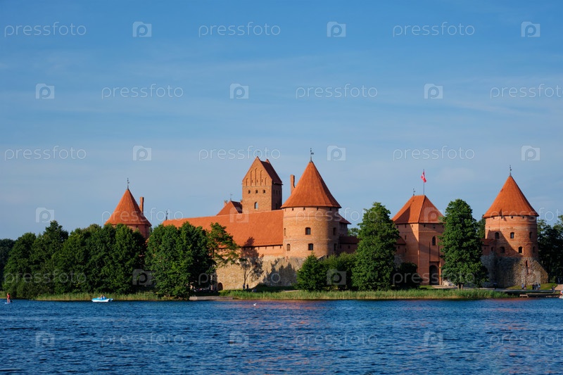 Островный замок Тракай на озере Гальве с лодками в летний день, Литва.Замок Тракай является одной из главных туристических достопримечательностей Литвы
