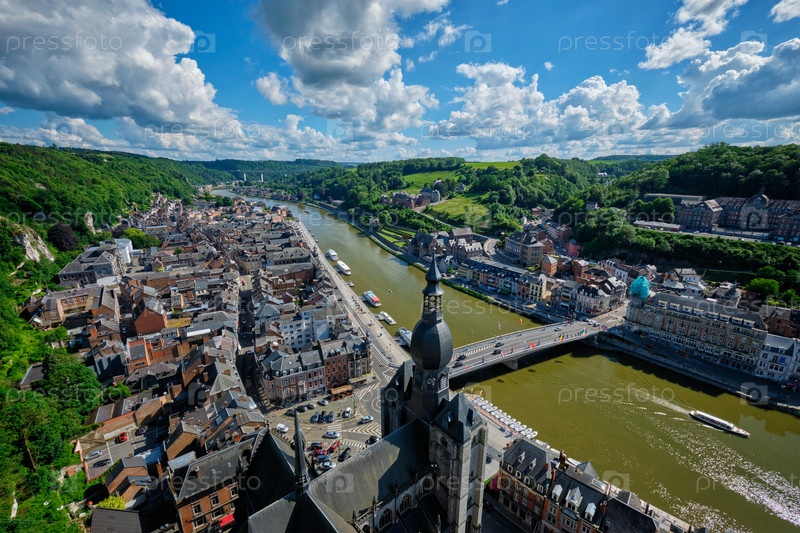 Вид с воздуха на город Динан, университетскую церковь Нотр-Дам де Динан, реку Мезу и мост Карла де Голля из Цитадели Динан