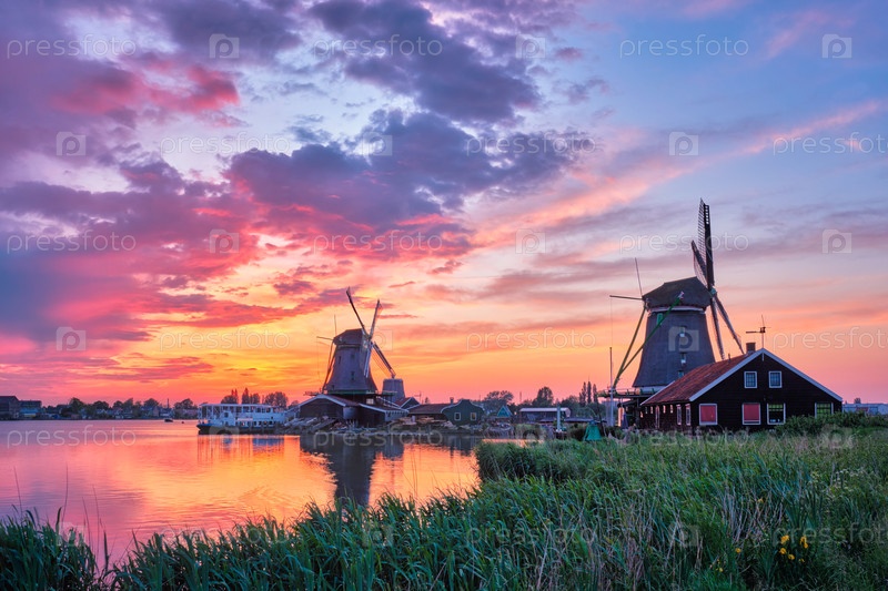 Голландская сельская сцена - это ветряные мельницы на знаменитом туристическом объекте Заансе-Шанс в Нидерландах при закате солнца с драматическим небом