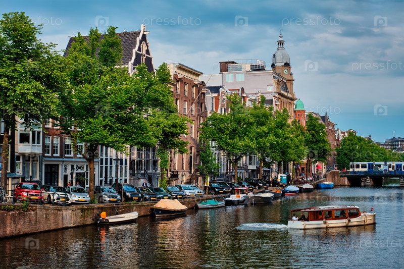 Вид на Амстердам - канал с туристической лодкой, мостом и старыми домами