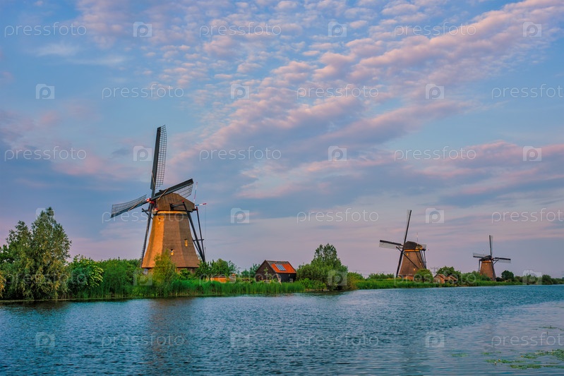 Голландский сельский пейзаж с ветряными мельницами на знаменитом туристическом месте Kinderdijk в Нидерландах при закате солнца с драматическим небом