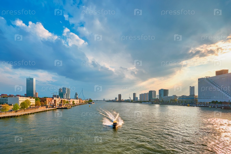 Вид на городской пейзаж Роттердама и Эразмусский мост над Ньюв-Маасом с кораблями и лодками