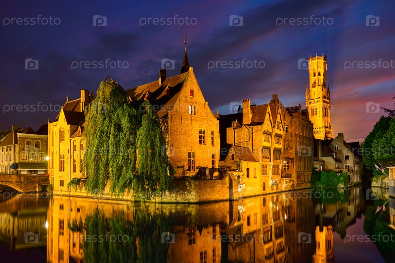 Известным видом на туристическую достопримечательность Брюгге является канал Розенхоedkaai с колокольником и старыми домами вдоль деревянного канала ночью
