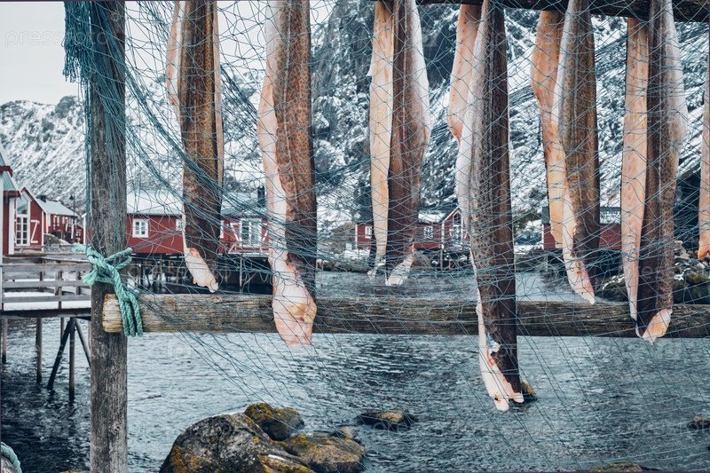 Сушка рыбной трески в аутентичной традиционной рыбацкой деревне Нусфьорд с традиционными домами красного руербу зимой на норвежском фьорде
