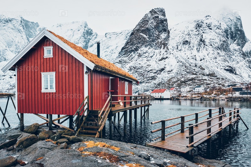 Традиционный дом красного руербу в деревне Рейн на Лофотенских островах,