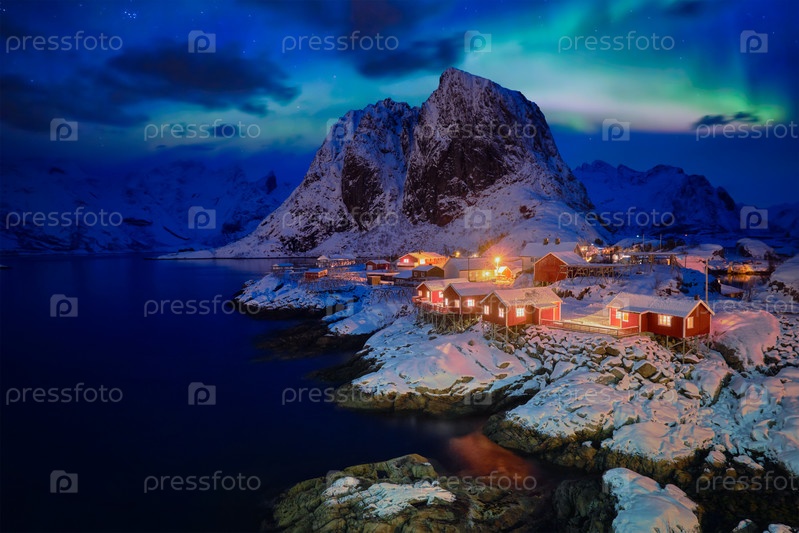 Известная туристическая достопримечательность рыбацкая деревня Хамна на Лофотенских островах, Норвегия с красными домами руербу в зимний снег освещается вечером от северной сияния