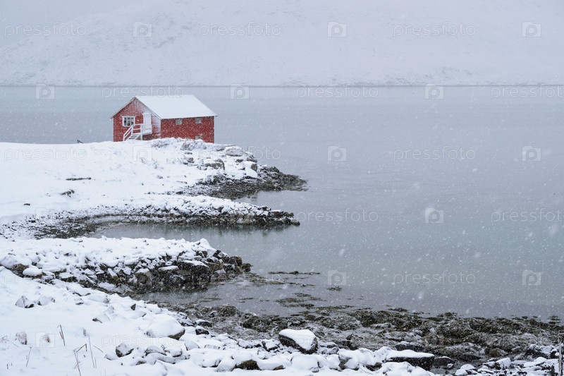 Традиционный красный дом рурбу на берегу фьорда с сильным снегом зимой.Острова Лофотен, Норвегия