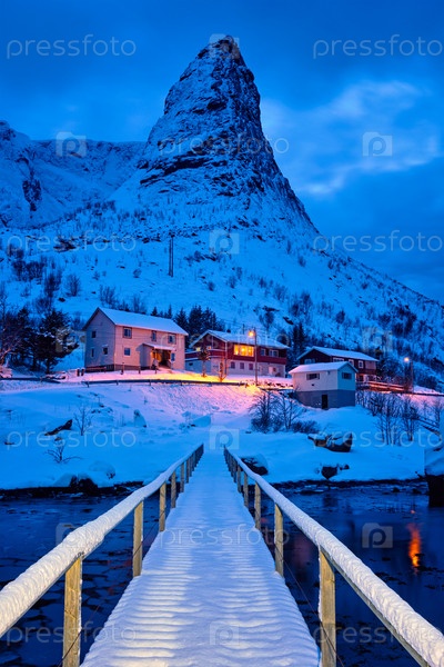 Деревня Рейна ночью.Острова Лофотен, Норвегия