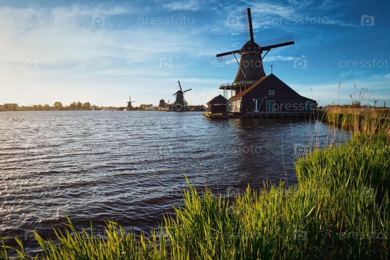 Ветряные мельницы в Заансе-Шанс в Голландии на закате