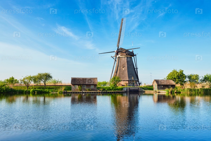 Голландская деревня с ветряными мельницами на знаменитом туристическом объекте Kinderdijk в Нидерландах