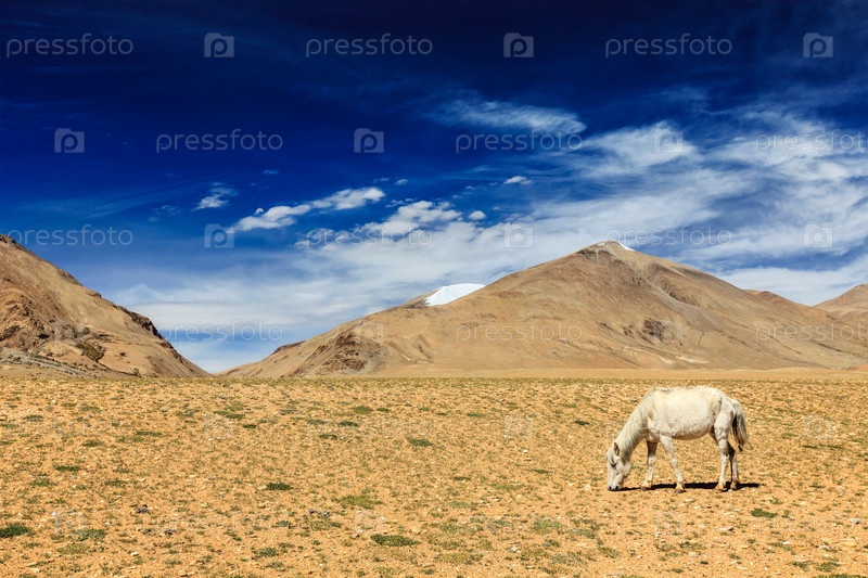 Белый конь пасется в Гималаях.Ладакх, Джамму и Кашмир, Индия