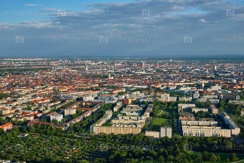 Вид из воздуха на центр Мюнхена с Олимпиатурма (Олимпийской башни).Мюнхен, Бавария, Германия