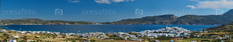 Панорама деревни Плака с традиционной греческой церковью, белоснежными греческими домами и берегом океана.Остров Милос, Греция