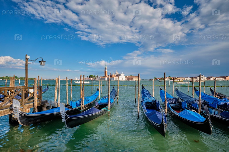 Гондолы и в лагуне Венеции на площади Святого Марка (Сан-Марко) с церковью San Giorgio di Maggiore на заднем плане в Венеции, Италия