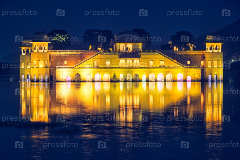 Раджастан является известной туристической достопримечательностью - Водный дворец Джаль Махал на озере Ман Сагар вечером при закате