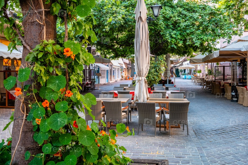 Живописные живописные улицы Ханьи Венецианский город с настуртием в переднем плане.Ханья, Крит, Греция