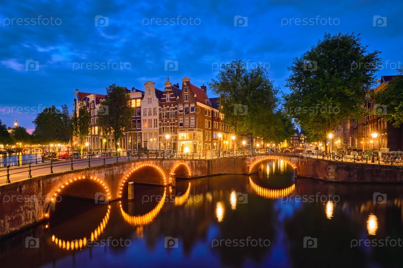Амстердамский канал, мост и средневековые дома вечером