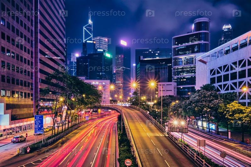 Уличное движение в Гонконге ночью.Офисные небоскребы и оживленный трафик на шоссе с размытыми пассажирскими дорожками.Гонконг, Китай