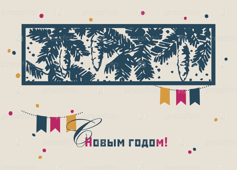 Векторная открытка с рождественской елкой, сосновыми шишками и гирляндой в винтажном стиле